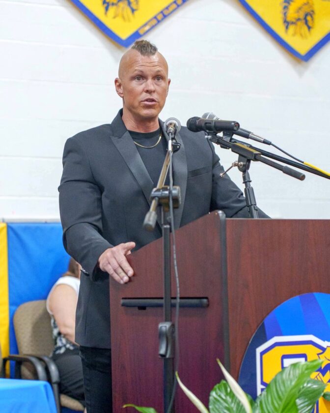 Intervention Specialist Michael Skrinjar at the Utica Shale Academy is proud of his students and grateful for a Best Practice Grant from the Jefferson County Educational Service Center that will help fund a student-run cafe and give them the experience of operating a small business. Skrinjar is pictured speaking during the 2025 graduation ceremony. (Submitted photo)