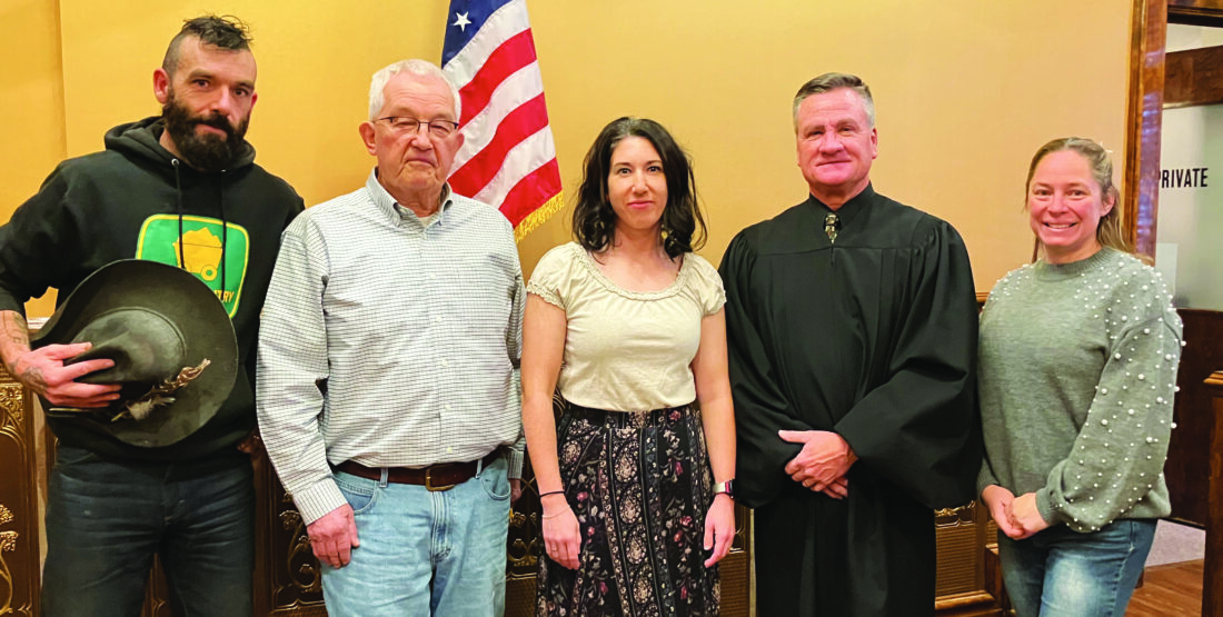 Columbiana County Park District board members celebrate the swearing in of newly-appointed member Megan McMaster of Columbiana and reappointed member Tom Butch of Salem to three-year terms Wednesday morning. Pictured from left are board members Joe Lawhorn, Tom Butch, Megan McMaster, county Probate/Juvenile Court Judge Thomas Baronzzi and board member Crystal Siembida Boggs. Not in attendance was board member Dave Hughes. (Photo by Mary Ann Greier)
