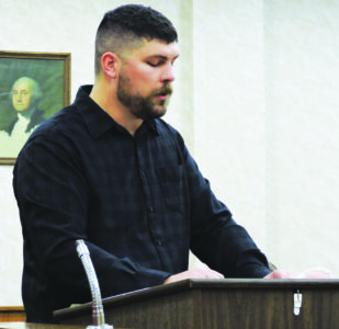 Hancock County resident Matthew Cole approached county commissioners Thursday, asking them to provide support for the growth of the natural gas industry in the county. Cole said he believes such growth can provide additional revenue to support Hancock County Schools. (Photo by Craig Howell)