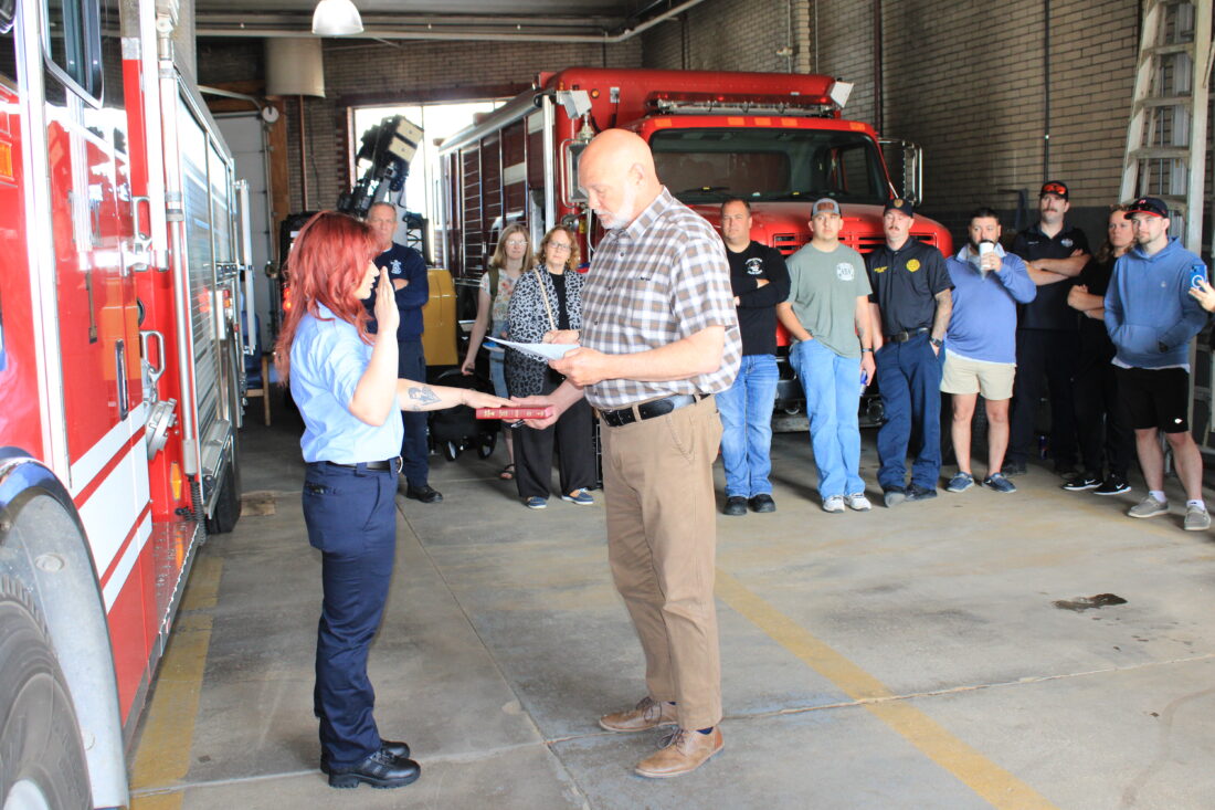 - Mayor Bobby Smith swears in East Liverpool Fire Department’s first female firefighter Brittany Hill. (Photo by Kristi R. Garabrandt)