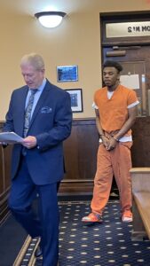 E’mory Nazay Chiles, 20, of Wellsville, enters Common Pleas Court led by his defense attorney, James Wise, prior to pleading guilty to felonious assault and tampering with evidence on Monday. (Photo by Mary Ann Greier)