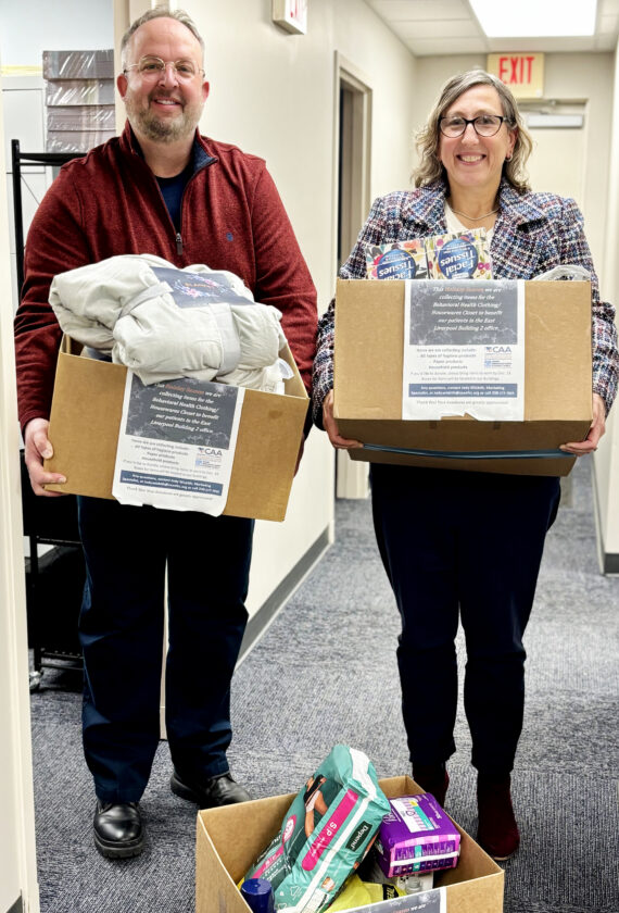 CAA Health, Behavioral Health and Dental Centers’ employees during the holidays donated several boxes of supplies for the CAA Behavioral Health Clothing and Housewares Closet. Items such as household paper products, hygiene supplies, laundry soap and cleaning supplies were donated and will be added to the pantry, which aids CAA patients and clients in need throughout the year. With some of the donated supplies are Chris Talbert, CAA Behavioral Health Case Manager, and Dr. Jill Hendrickson, a licensed psychologist and director of CAA’s Behavioral Health. (Submitted photo)
