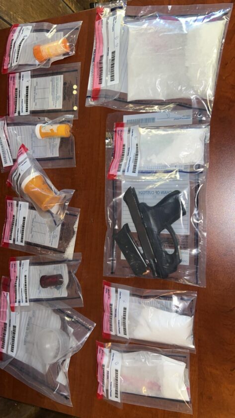 During the search, DTF agents found more than 70 grams of suspected cocaine with a street value of approximately $50 to $100 a gram, prescription pills, a few grams of methamphetamine, a loaded 9mm handgun, packing material consistent with drug trafficking and a large amount of cutting substance which Smith noted to be commonly used by drug dealers to mix into the drugs to increase the volume for resale.