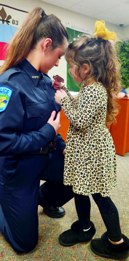 New officer Mikayla McCulley, St. Clair Township Police Department, is pinned with her badge by daughter McKinlee Cope, 3, during the St. Clair Township Board of Trustees meeting. (Photo by Kristi R. Garabrandt)