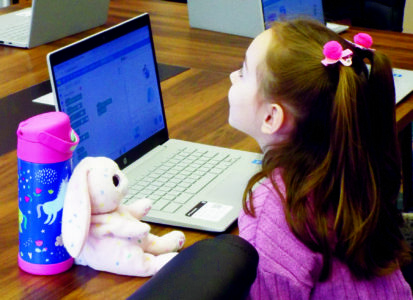Aubree Reed, 8, a third-grade student at Hancock County Schools, and her best pink bunny learn about coding during Monday’s Community Baby Shower at the Chester Municipal Building hosted by Hancock County Family Support Center and the county’s Partners in Prevention. Parents and caregivers for children between prenatal and age 2 attended the annual event. (Photo by Stephanie Ujhelyi)