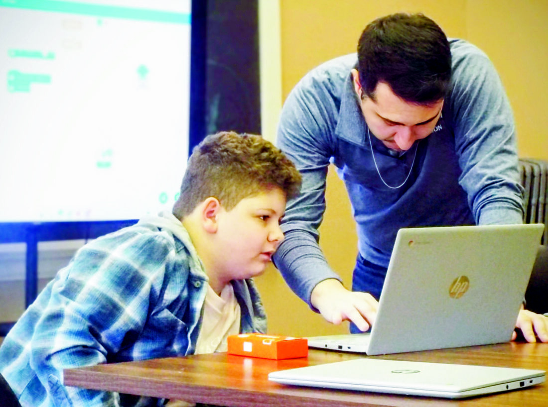 - At right, WVU Extension agent Zach White works on coding Hancock County Schools’ student Jeremy Adams’ driverless train Monday morning during a youth development session held during a Community Baby Shower event in Chester. White’s code then when linked to the train of Adams, 9, provide the vehicle with operational commands. (Photo by Stephanie Ujhelyi)