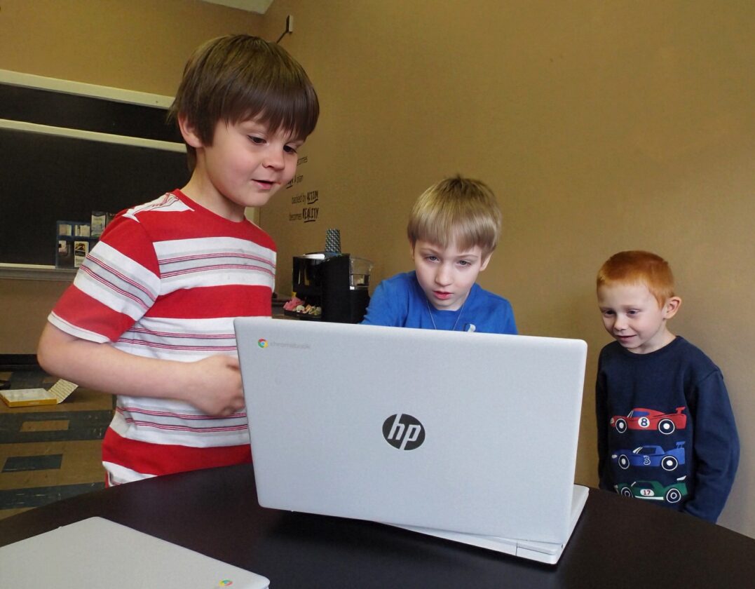 - Hancock County students John O’Roarke, Gage Vasso and Ezra Tremain, all age 6 and of Chester, work on the coding for their driveless train Monday morning during a WVU Extension presentation regarding coding and engineering. The trio were among a dozen children up to age 10 attending the workshop while their caregivers were on hand a lunch and resource fair for the Community Baby Shower. (Photo by Stephanie Ujhelyi)