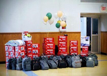 - Diapers, backpacks and other baby needs were on display for distribution to caregivers attending the Hancock County Family Support Center and Partners in Prevention’s annual Community Baby Shower Monday in Chester Municipal Building. (Photo by Stephanie Ujhelyi)