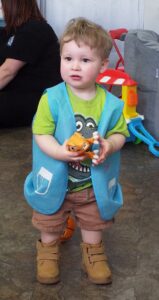 - Hancock County toddler Arthur Wilcox holds a dinosaur Monday morning in a littles’ child care area in the Hancock County Family Support Center, as his caregivers attend the annual Community Baby Shower in the all-purpose room and gymnasium of Chester Municipal Building. The event, which was sponsored by FSC and the Hancock Partners in Prevention, included a resource fair, free baby items like diapers, a catered lunch and games for moms, dads and kids. (Photo by Stephanie Ujhelyi)