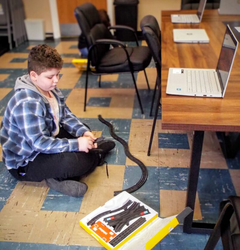 - Hancock County Schools’ student Jeremy Adams, 9, works on assembling the track for his driverless train Monday morning during a WVU Extension youth development session held during a Community Baby Shower event in Chester. Using laptops, then Adams would use coding to give the vehicle operational commands. (Photo by Stephanie Ujhelyi)
