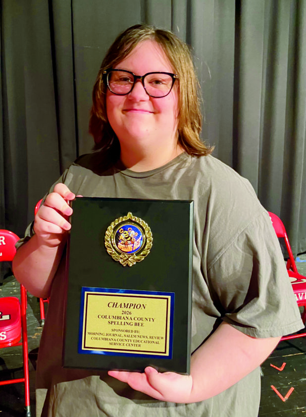 - Caitlin Clonch, 14, an eighth grader at Crestview, holds the championship plaque for the Columbiana County Spelling Bee. Her school will now receive the county spelling bee traveling plaque after her name is engraved as the 2026 champion. (Photo by Mary Ann Greier)
