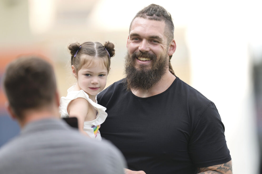 Former Denver Broncos defensive lineman Derek Wolfe, right, holds daughter Roxanna as he is greeted by media members while attending the team’s training camp Friday in Centennial, Colo. The Beaver Local graduate signed a one-day contract to retire as a Bronco on Friday. (AP Photo)
