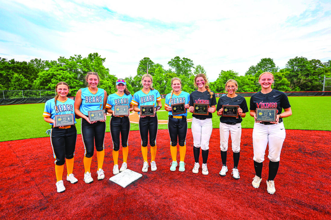 Members of the West Virginia Class AA state softball all-tournament team are (from left) Oak Glen’s Kayla Wright, Danica Holden, Mikalyn Balch, Mattie Carney, Riley Bruce; Petersburg’s Miley Tingler, Shyane Tawney and Ella Chew. Not pictured is Logan’s Myleigh Adkins and Addison Star. Oak Glen won its first softball state title since 1998 with a 10-2 win over Petersburg on Thursday in South Charleston. (Photo by WVSSAC)