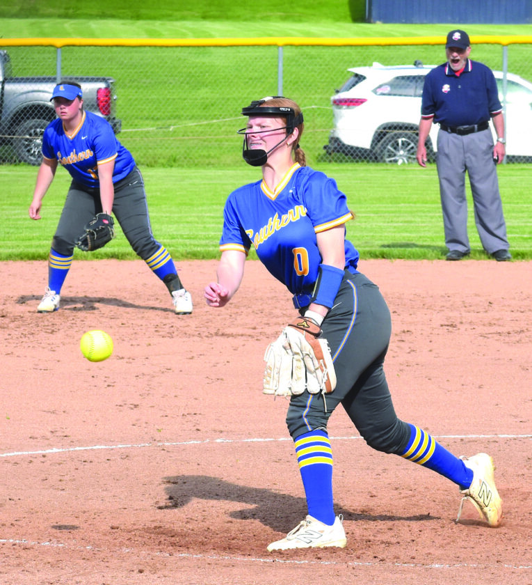 Southern’s Addy Martin pitches against United on Wednesday in a Div. VI sectional game. Looking on is Kennedy Lewis.