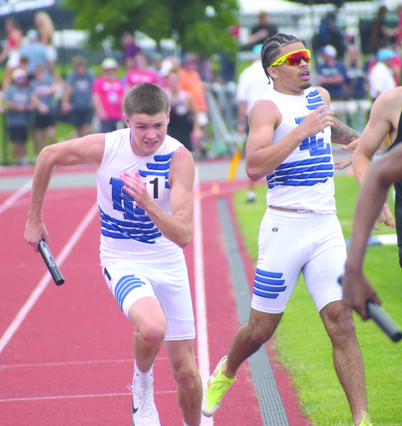 East Liverpool’s Brody Vulgamore takes the baton from Quintin Conrad in the Div. II 3200-meter relay on Friday at the state track meet at Jesse Owens Memorial Stadium in Columbus.