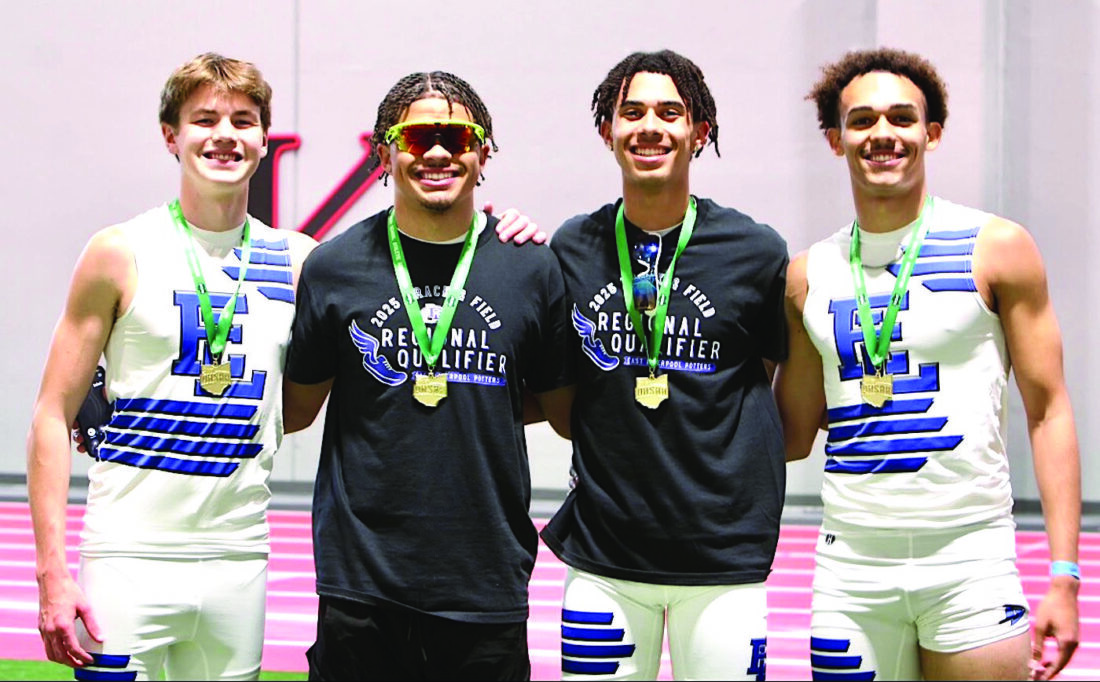 The East Liverpool boys 3200-meter relay team of (from left) Brody Vulgamore, Quintin Conrad, Maddox Roach and Julius Jones will run in the Division II state finals at 1:45 p.m. Friday. The Potters’ time of 7:51.42 is the fastest in Division II this season. (Submitted Photo)