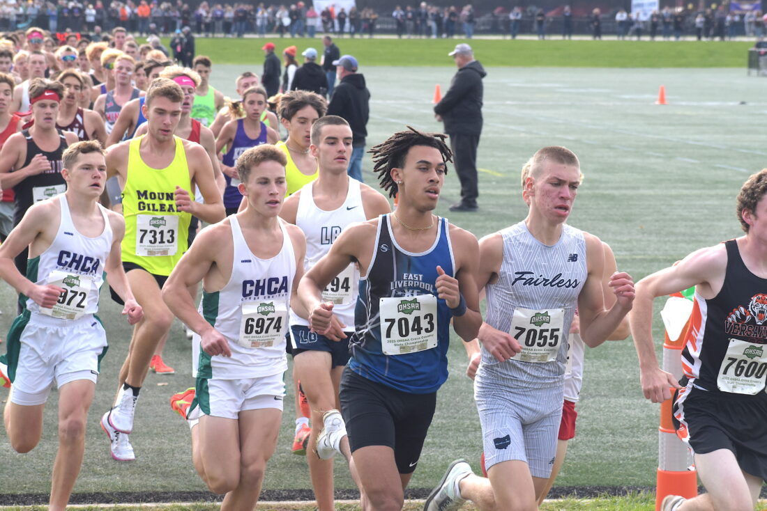 East Liverpool’s Maddox Roach runs along side Div. III state champion Brice Fuller of Fairless on Saturday at the state cross country meet at Fortress Obetz. (Photo by Ron Firth)