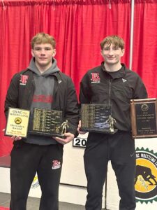 Beaver Local’s Jake Hughes (left) was presented with the Ohio Valley Athletic Conference Hercules Award for the most pins in the least amount of time on Saturday at WesBanco Arena. Beaver Local’s Bobby Buchheit (right) was presented the Most Outstanding Wrestler Award for his fourth individual OVAC title of his career. (Beaver Local Wrestling)