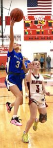 East Liverpool’s LaNease Andrews scores two of her 25 points against Beaver Local’s Mercedes McCullough in a Division IV sectional final Thursday. (The Review/Jimmy Joe Savage)