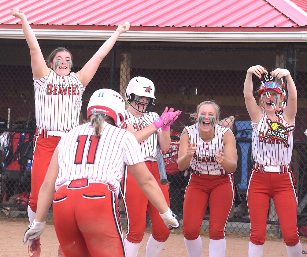 Beaver Local’s Mya Anderson (11) crosses home plate after hitting a home run Monday and is congratulated by teammates (from left) Calleigh Eells, Macie Bourne, Ciara Call and Carlee Crabtree.